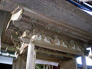 この門は、道場・太子講堂・宿坊などに出入りする為の門です。当山の建造物は、ほとんどが江戸時代に再建や改築されたもので、その年代がわかります。しかし、この四脚門のみ建設の年代が不明ですが1505年~1520年に建立されたと推定されます。大寺院の門は、その構造上から重層門と単層門に分けられますが、この四脚門は単層門で2本の主柱の前後にそれぞれ2本ずつ控え柱を配した平面の門で、正面は1間、側面は2間。萱葺屋根の切妻造りで、この構架のあたりにも室町時代の手法が伺えます。関東地方でも優れた建築構架のみられる四脚門です。
