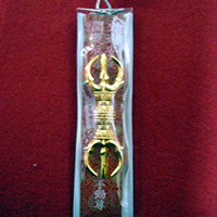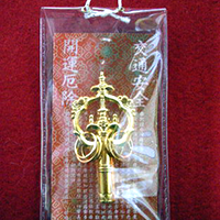 | 密教仏具の錫杖をかたどった交通安全・災難除のお守りです。 | 密教仏具の三鈷杵をかたどった交通安全・災難除のお守りです。 |
